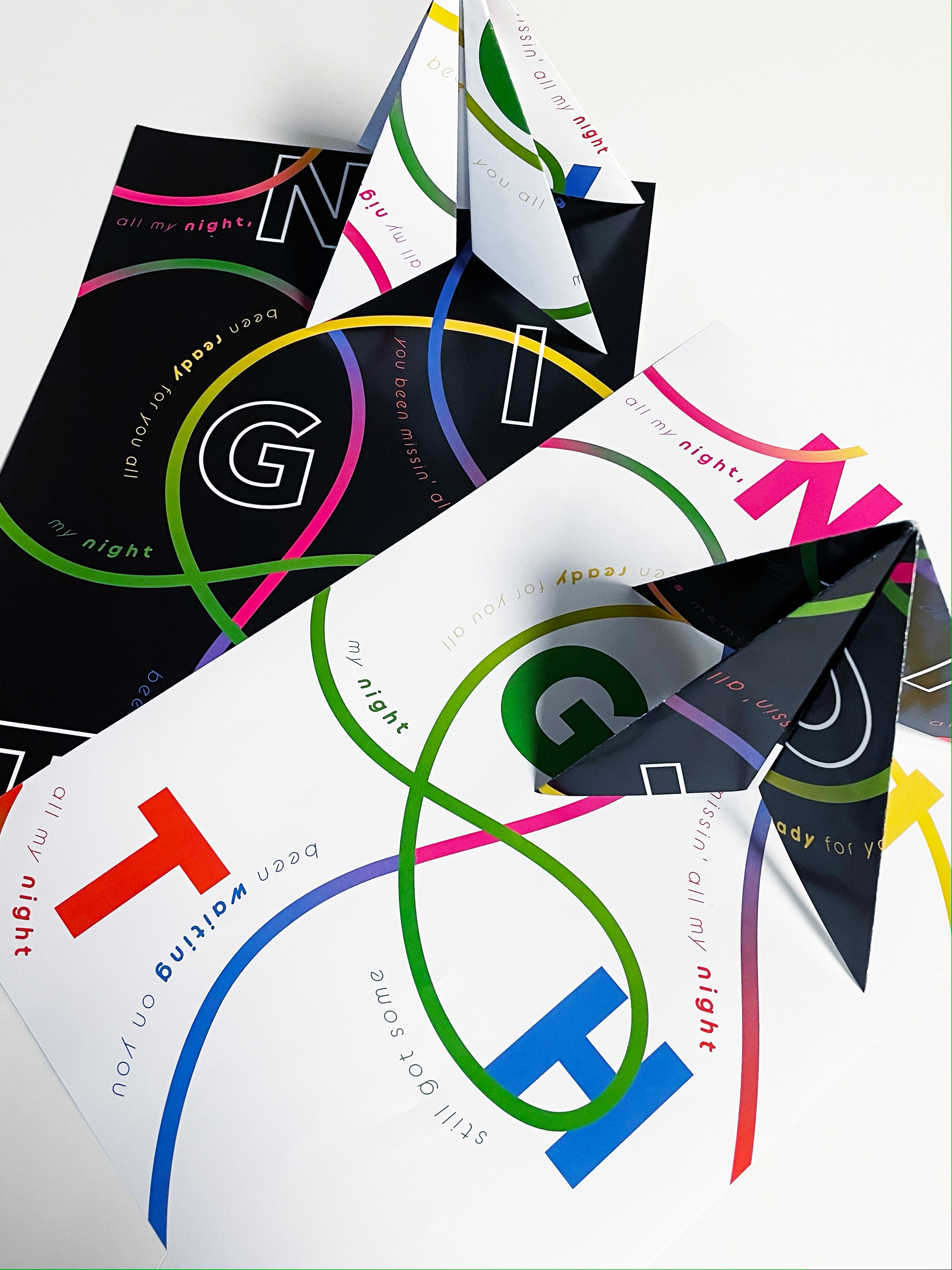 Inspired by Frank Ocean’s song “Nights”, these lyrical posters feature experimental typographic systems paired with a bright gradient color palette. Also displayed are potential “Blonde” album tour collateral including tour date posters, postcards, stickers, and ticket stubs. [Typographic Systems, Experimental Typography, Event Design , Branding]