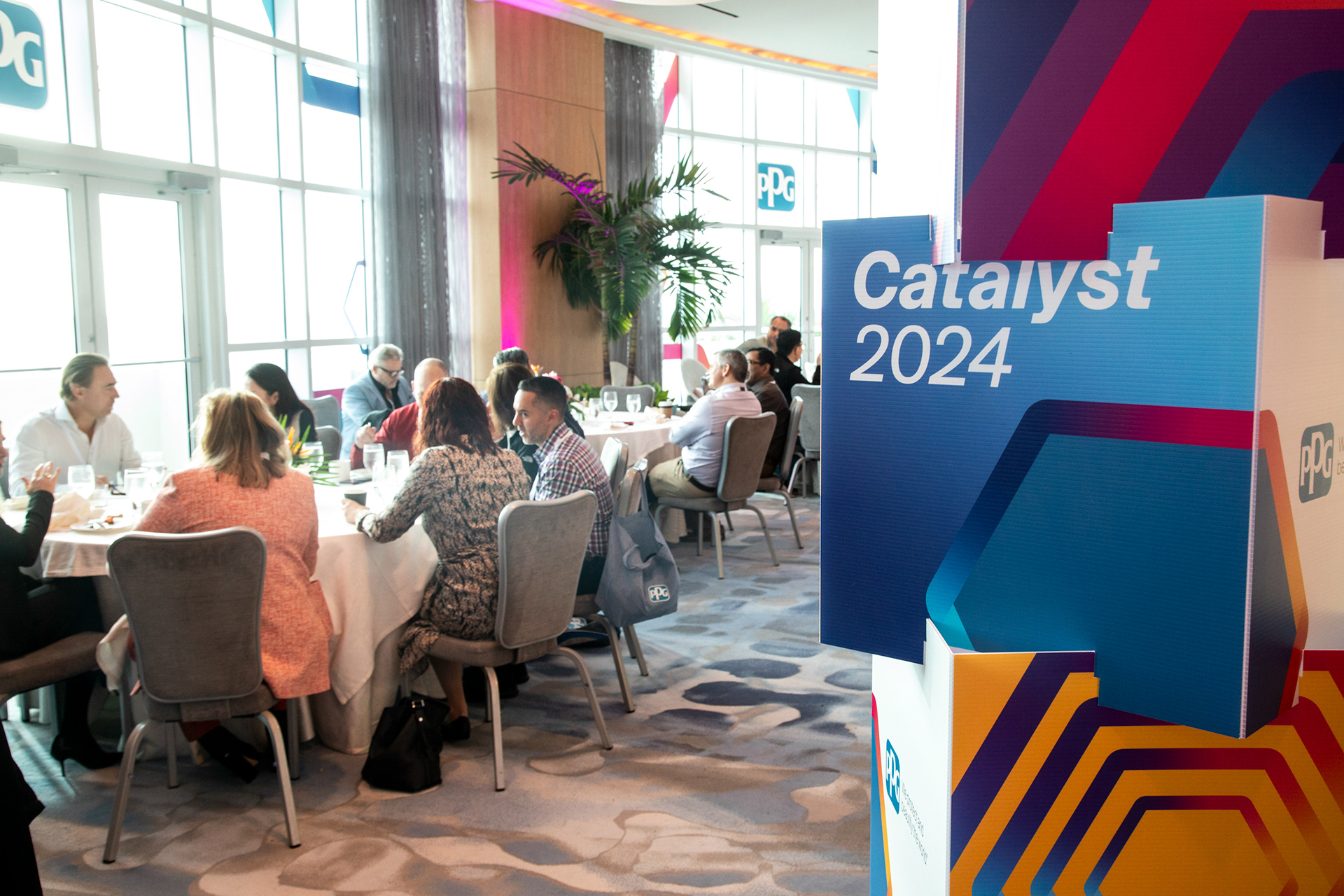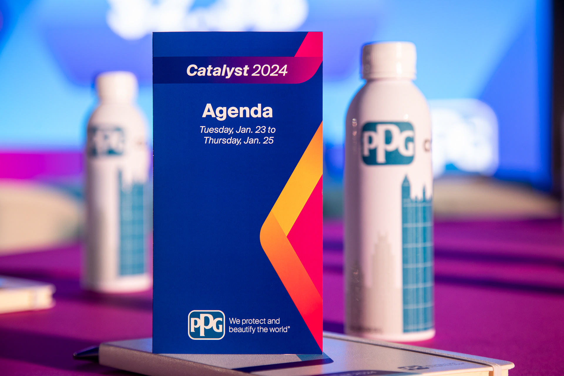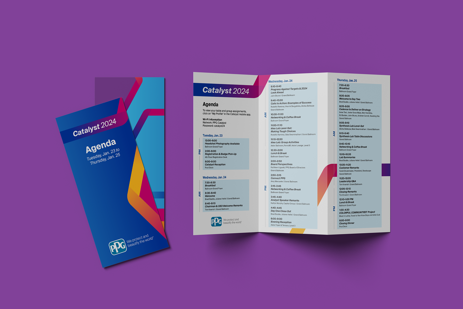 PPG's Annual Meeting "Catalyst 2024" displays sleek shapes and vibrant gradients. Deliverables included printed/ digital agendas, breakout room signage, worksheet packet layouts, & branded cube displays. [Event Design, Type Layout, Printed Signage]