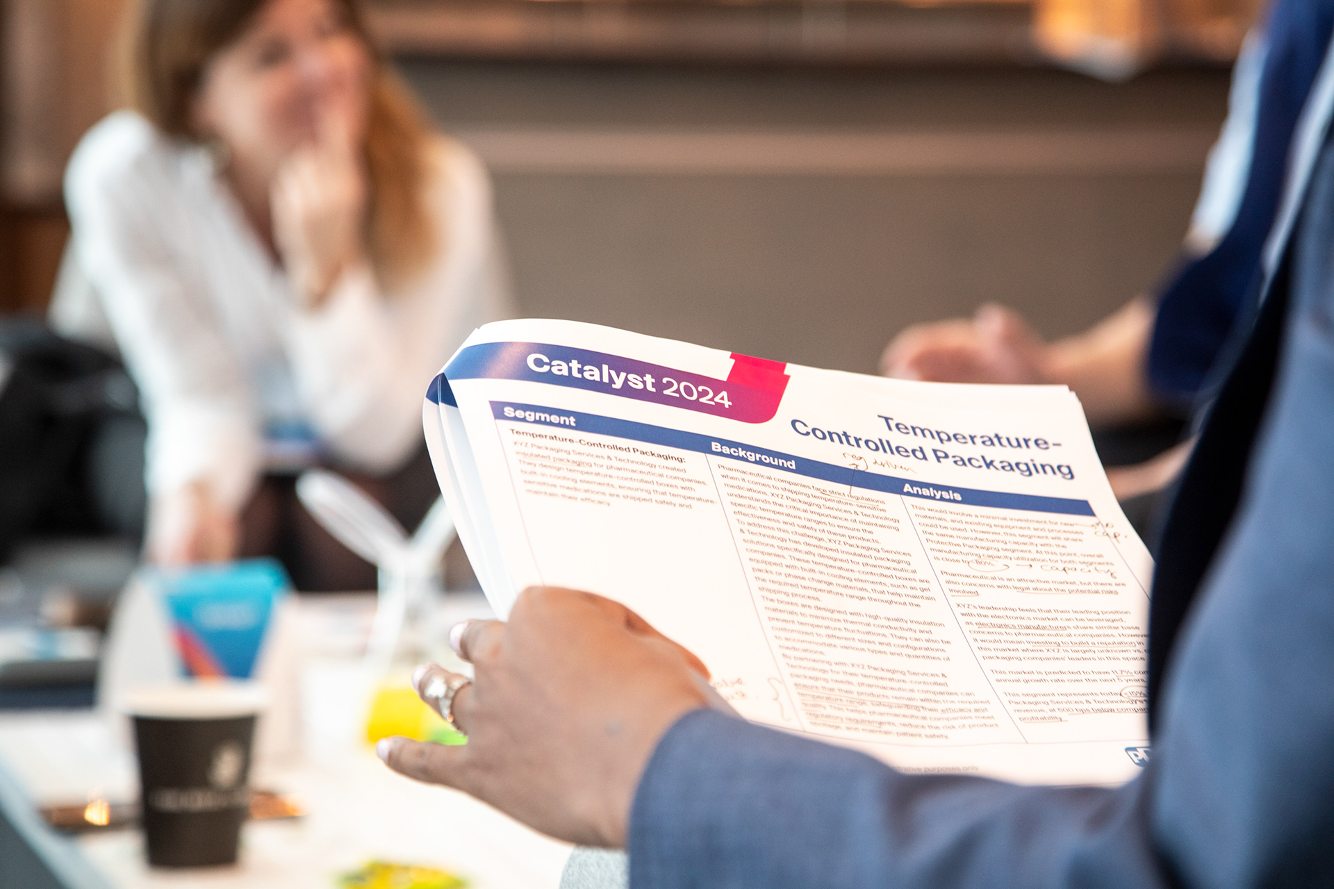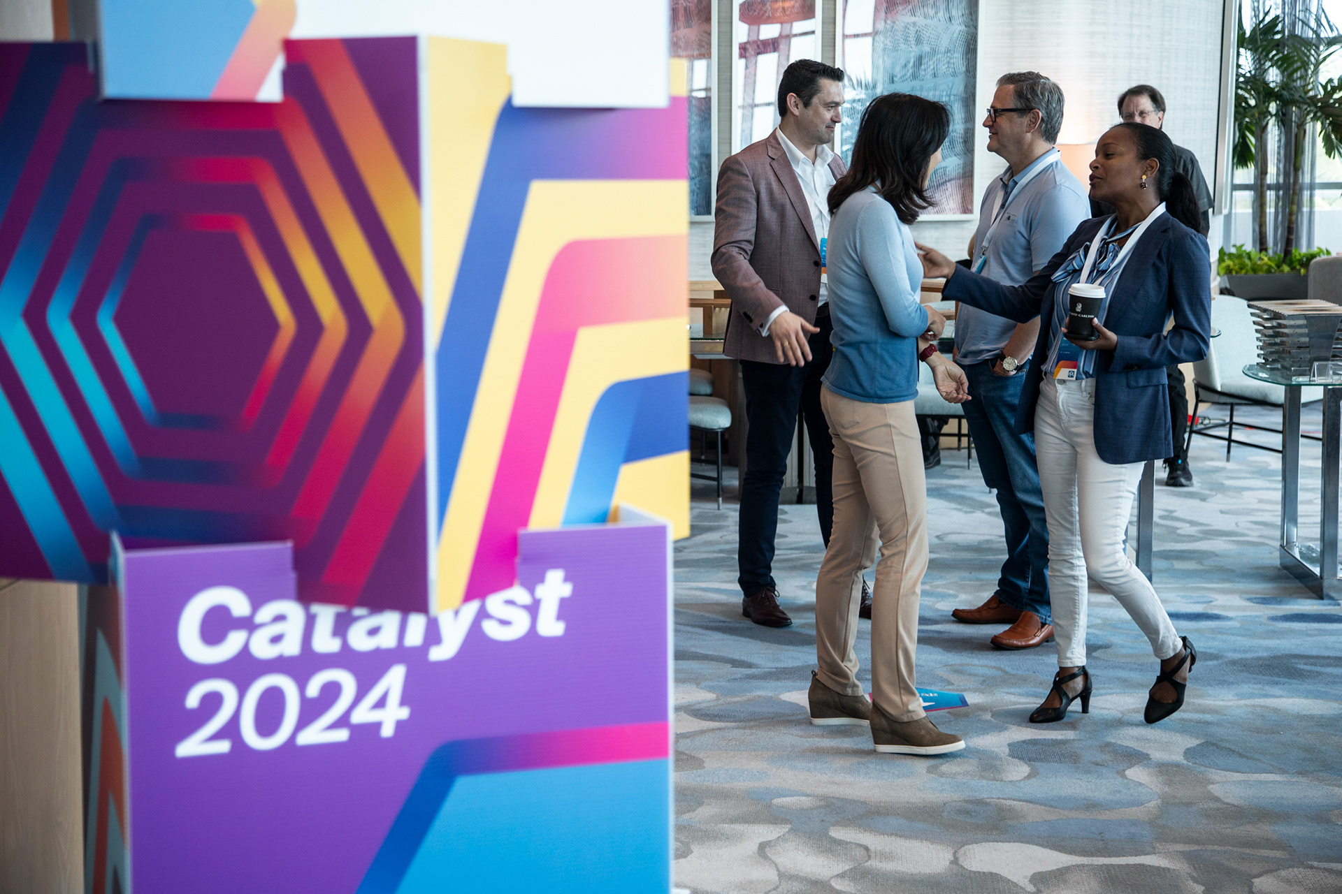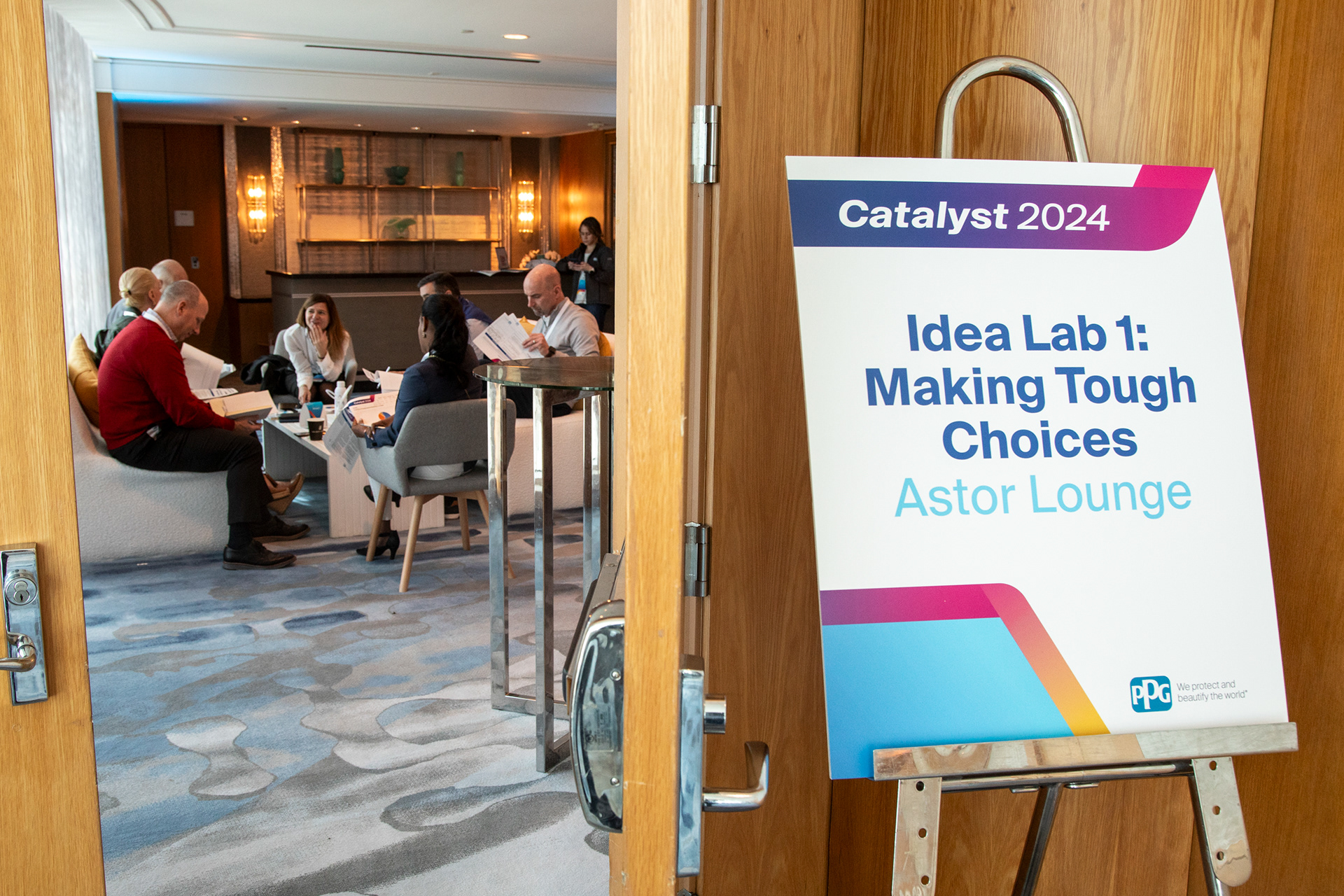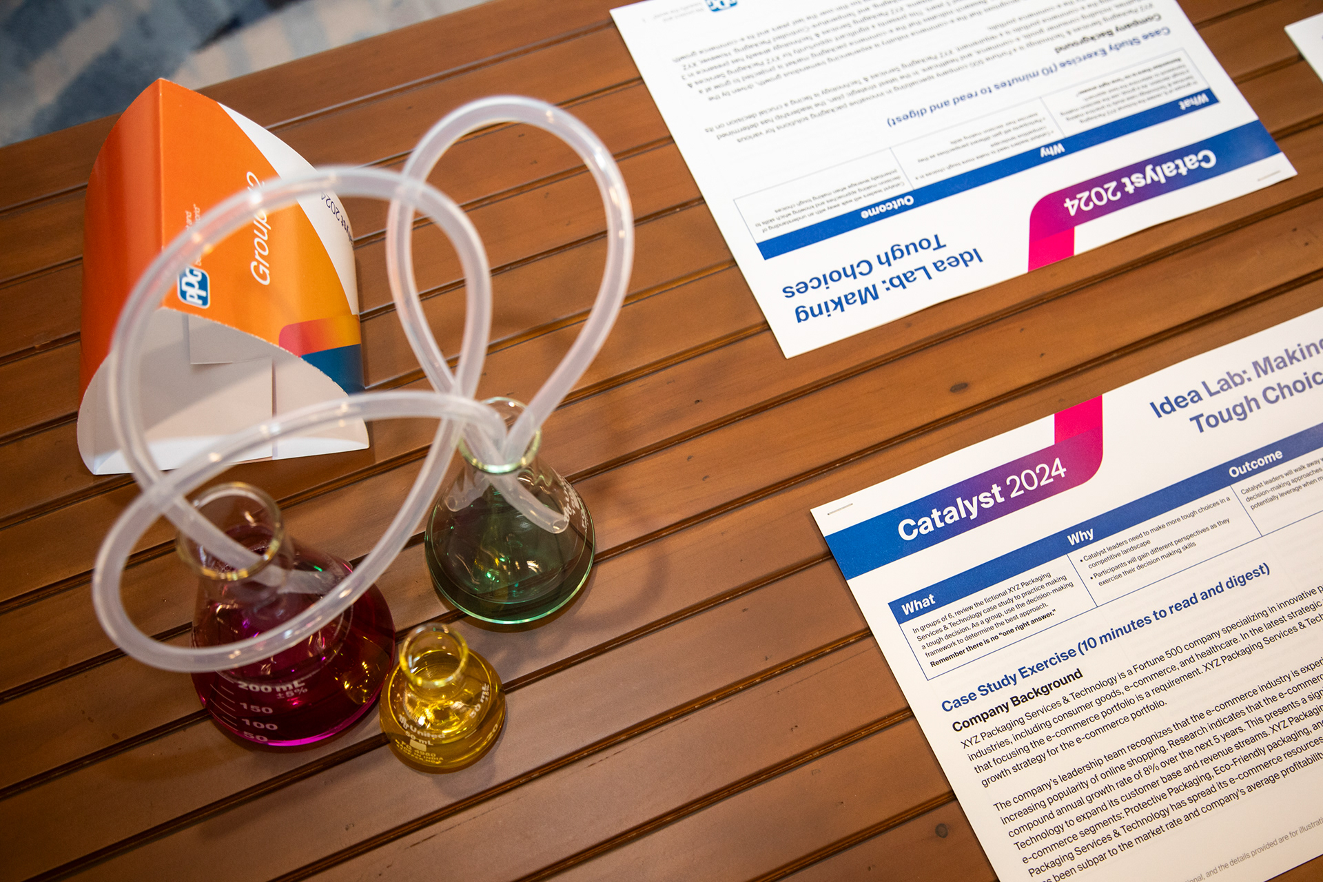 PPG's Annual Meeting "Catalyst 2024" displays sleek shapes and vibrant gradients. Deliverables included printed/ digital agendas, breakout room signage, worksheet packet layouts, & branded cube displays. [Event Design, Type Layout, Printed Signage]